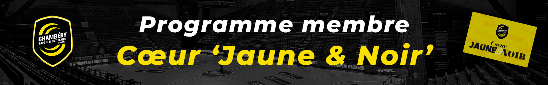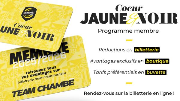 La passion et la ferveur Jaune & Noir disponibles entre vos mains. Rejoignez la communauté Jaune & Noir dès maintenant et intégrez la grande famille de la Team Chambé grâce au nouveau programme Cœur ‘Jaune & Noir’. Portez haut les couleurs de la Team Chambé et profitez de nombreux avantages toute l'année, pour vivre une saison d'exception.